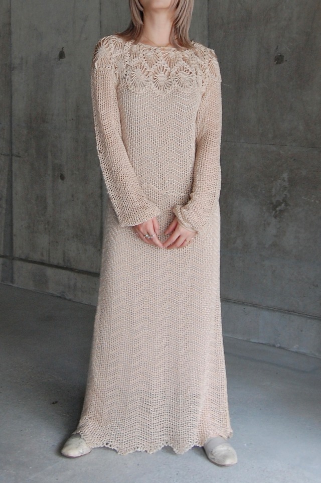 どの角度から見ても美しい、クロシェ編みのロングドレス! シンプルだからこそ拘りも惹き立ち、しっかりと気分を高めてくれます。♡ 2色の毛糸が使用されており、柔らかな色合いが目を惹きます。落ち着いた色味でデイリーにお手持ちのお洋服とも合わせやすいと思います◎ 体に程よくフィットするようなシルエットなので、ボディラインもきれいに見せてくれますし、 伸縮性もあり、ちくちく感も無し!ストレスフリーです!うれしい! 袖はほんのりと縛られておりバルーンスリーブに♡ 首元は網み模様が違っていて、つけ襟をしているように見えるのもめっちゃかわいいです…! 個人的にも総レースのロングドレス、持っているのですがめちゃくちゃ使ってまして どんなアイテムにも絶対合ってくれるので困った時には間違いなく重宝しますよ☺︎! スタイリングの振り幅も広く、シーズンレスにおすすめなドレスです♡ サイズ : 着丈 約125cm 肩幅 約36cm~ 裄丈 約68cm 色 : ベージュ 素材 : ニット ポケット: --- 着脱方法 : 被り 裏地:無し 透け感:有り コンディション: 特筆するような目立つダメージはなく、ビンテージにご理解頂いている方でしたら問題なく着て頂けると思います。 ⚫︎着用スタッフは身長158cm、平均体重です。 ⚫︎コンディションは出来る限りお写真にて掲載しておりますが、古着特有の使用感、小さなほつれがある場合が御座います。古着ということを理解頂いた上で購入をお願い致します。 ⚫︎商品のお写真は出来る限り実物のお色に近付けるようにしておりますが、お客様のお使いのモニター設定、又は照明等により実際の商品と色味が異なる場合が御座います。 ⚫︎返品・交換は基本的に受け付けてません。 ⚫︎こちらの商品は店頭でも販売しております為、行き違いでSOLD OUTとなってる場合が御座います。予めご了承くださいませ。