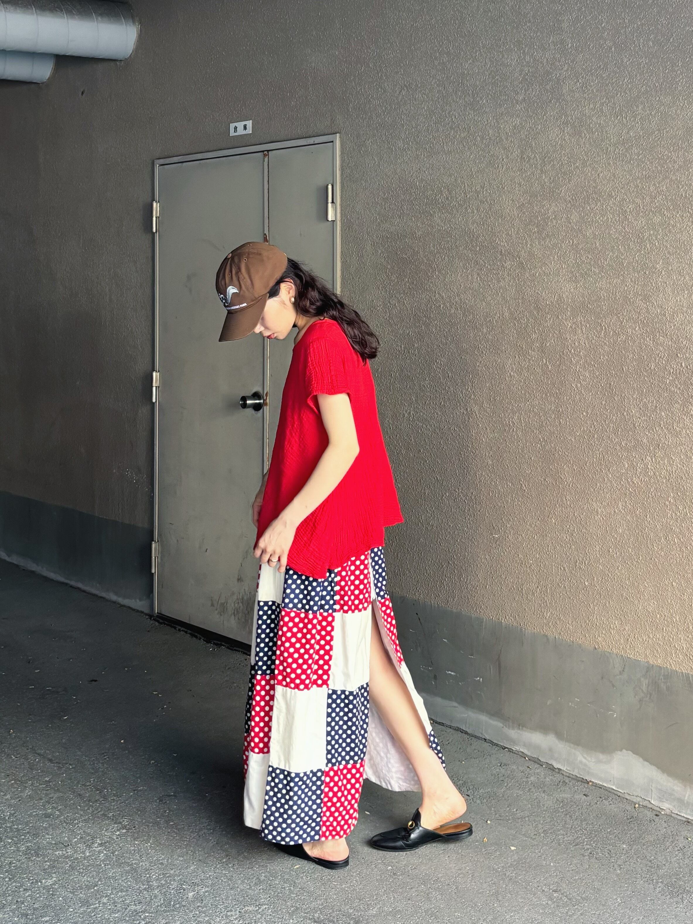 今の季節は写真のように同系色の柄スカートなどとも高相性です◎