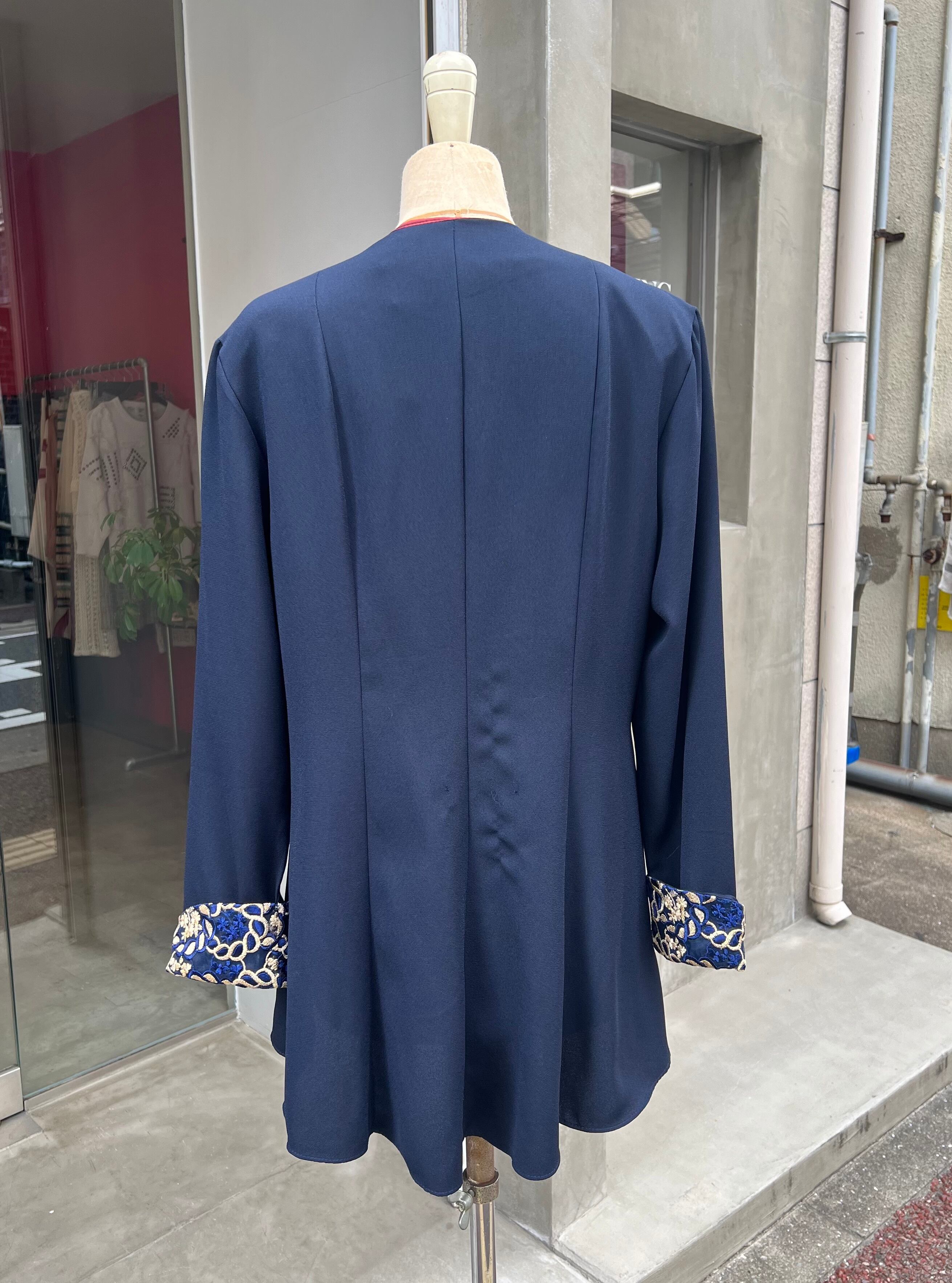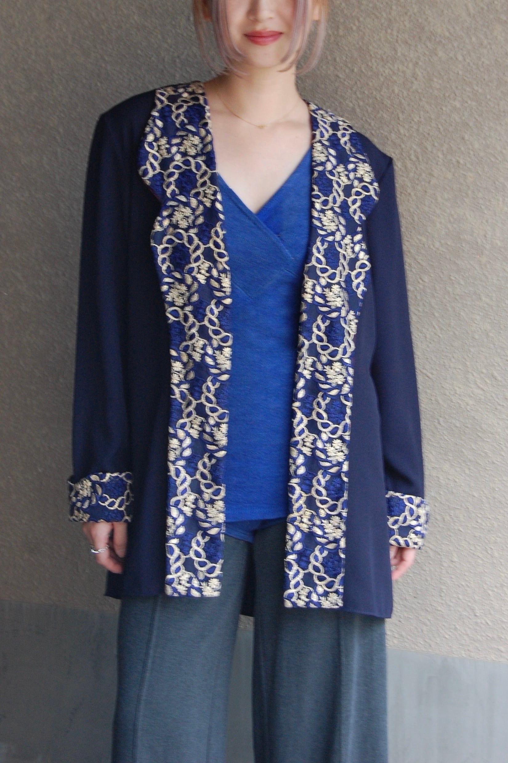 ネイビーのボディにゴールドの刺繍が大胆に映える、80’sらしいムードたっぷりのジャケット。