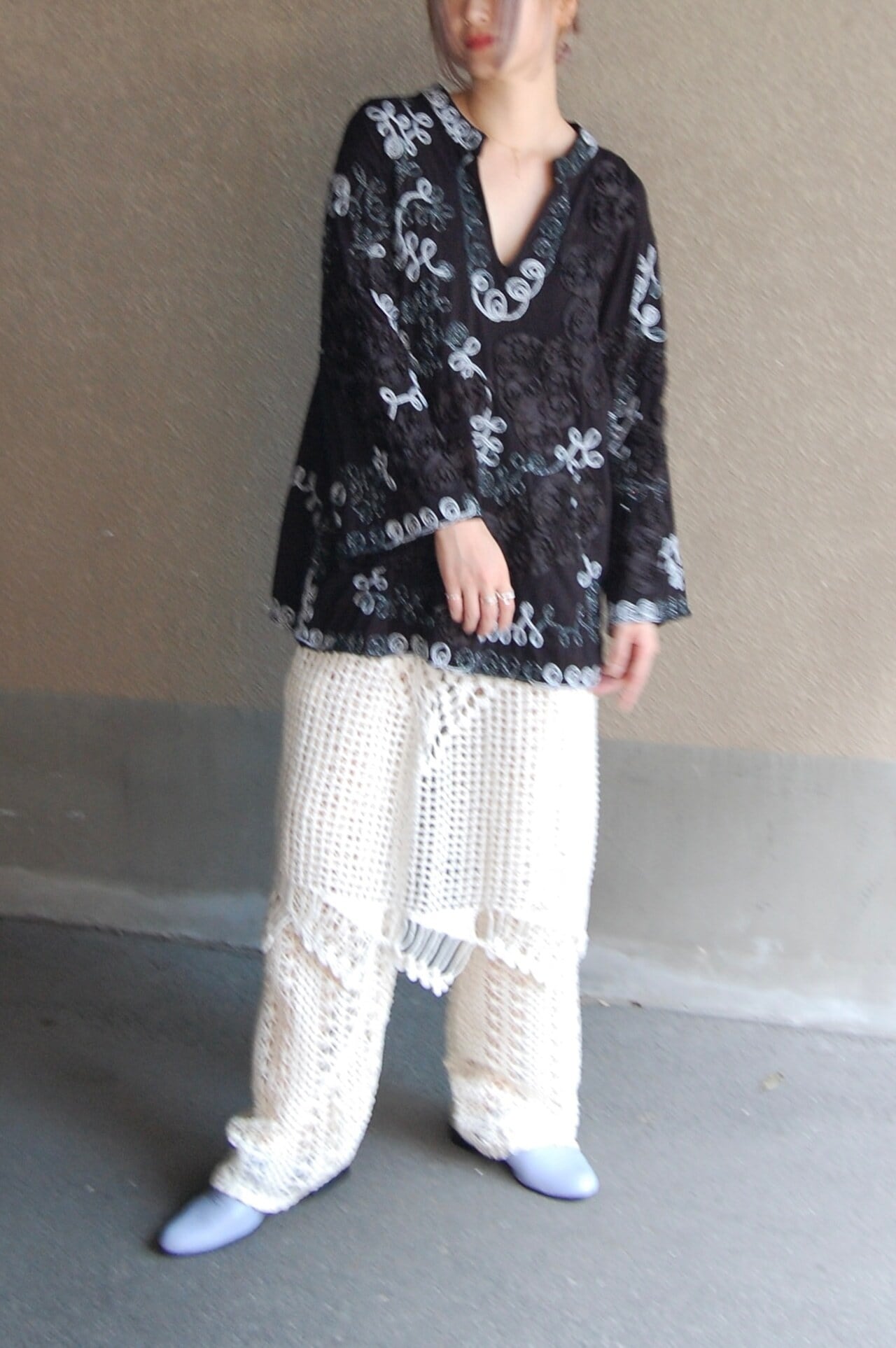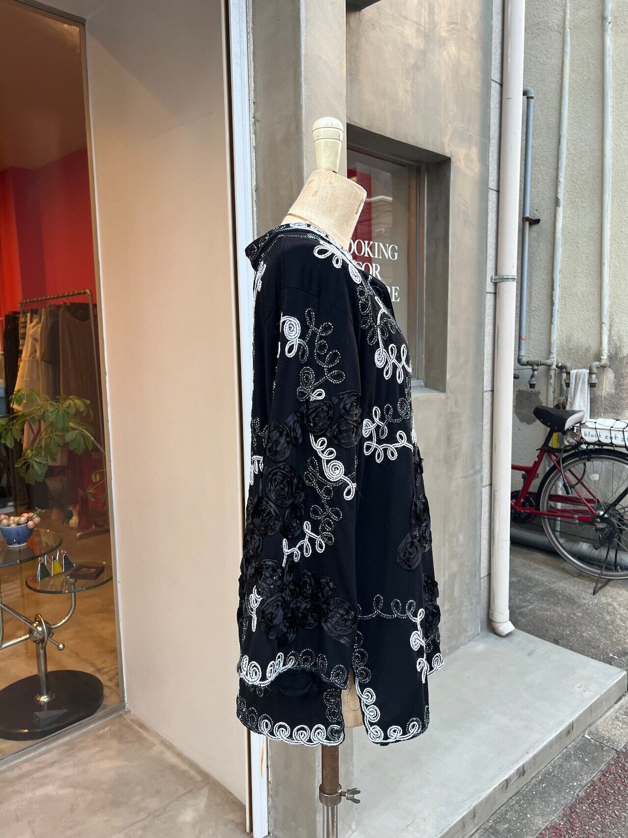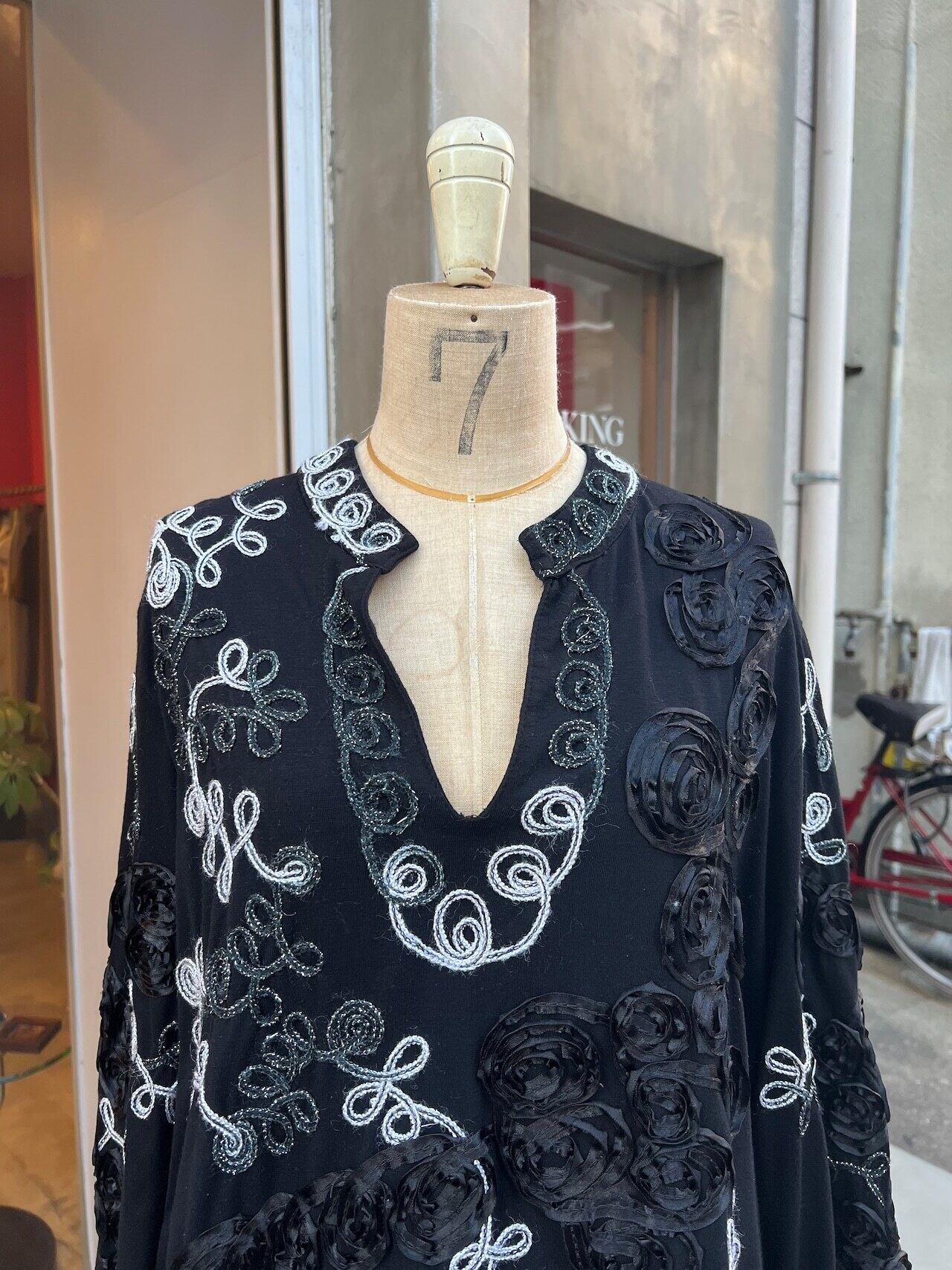 ボヘミアンテイストな たっぷりとあしらわれたテープ刺繍がどの角度からみてもたのしめる一着。
