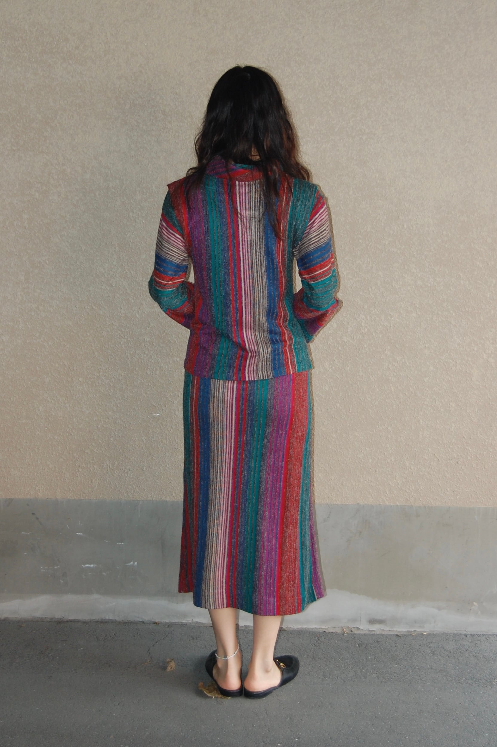 深みのあるカラフルなストライプが目を惹くニットのセットアップ。