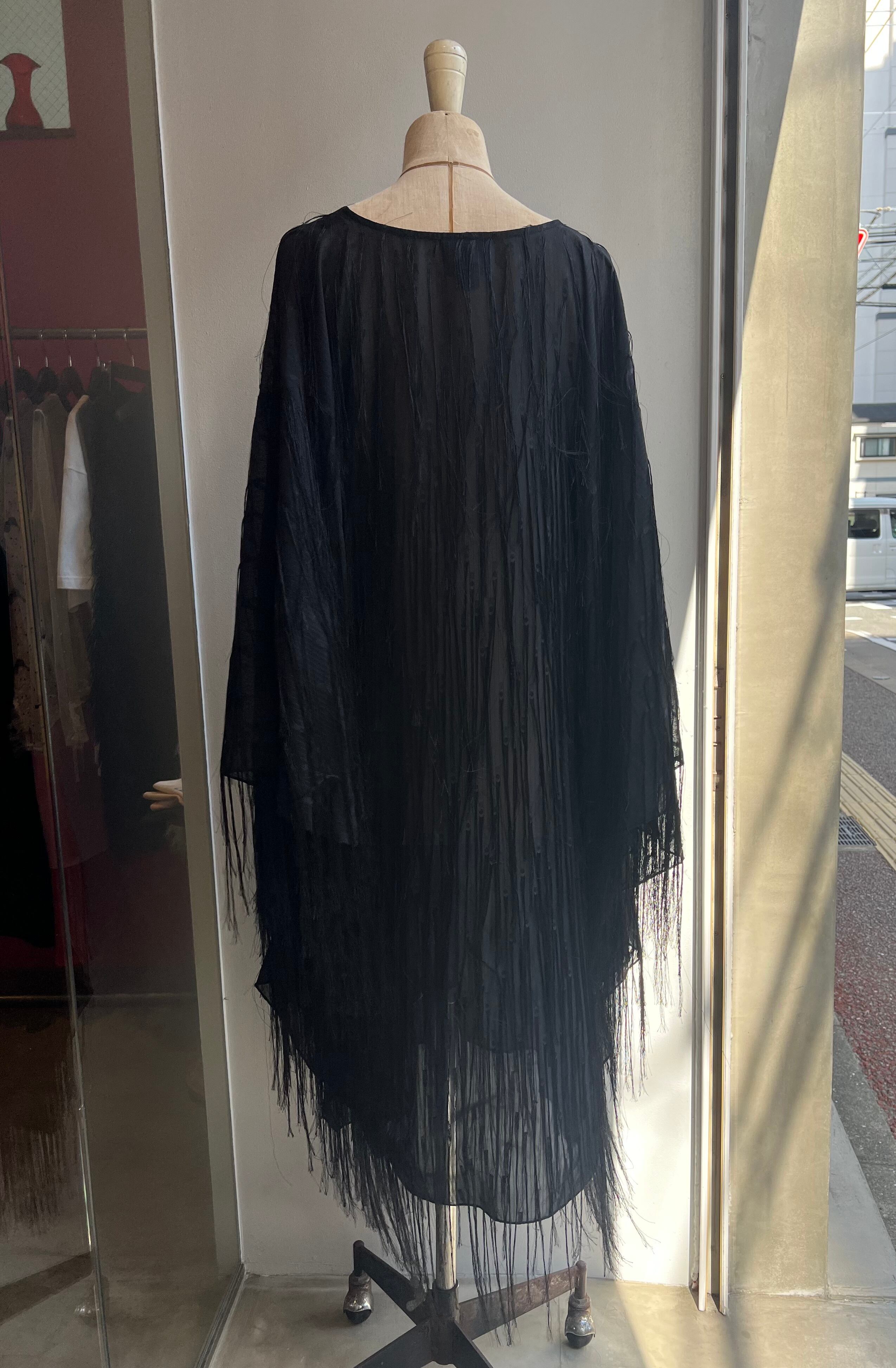なんだか魔女のような不思議な印象を受けるブラック一色のフリンジポンチョドレス。◯