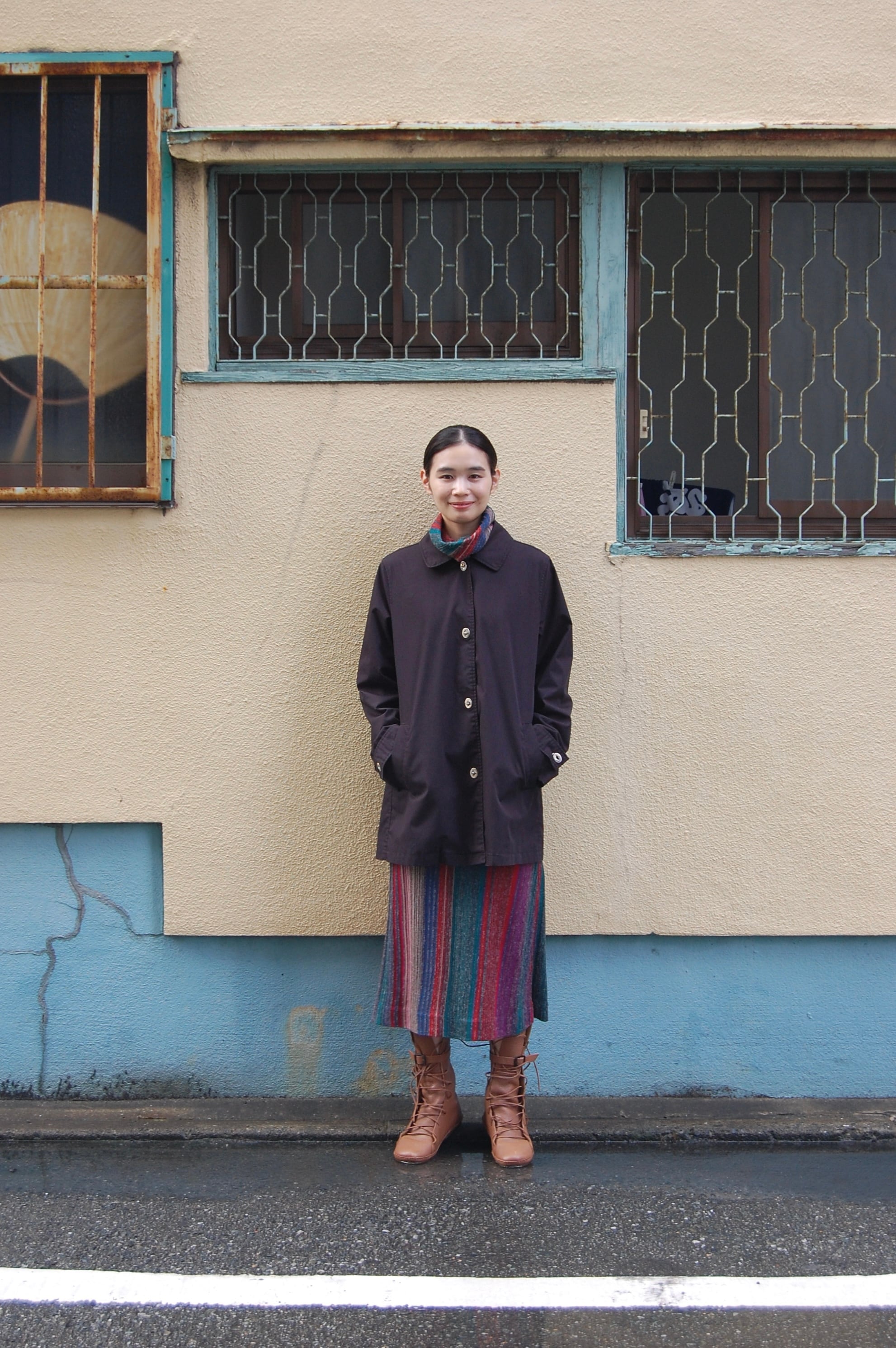 ステンカラーコートのような、すとんと落ちる綺麗なシルエットにフロントのフックが特徴的です。