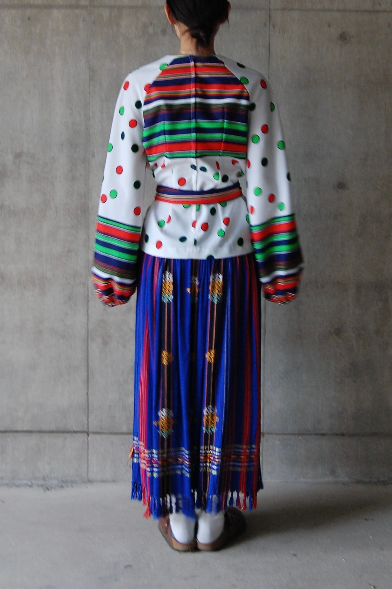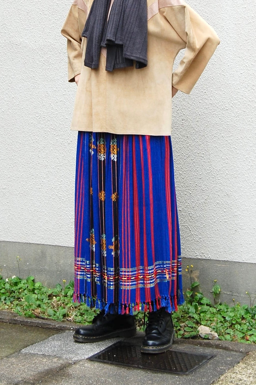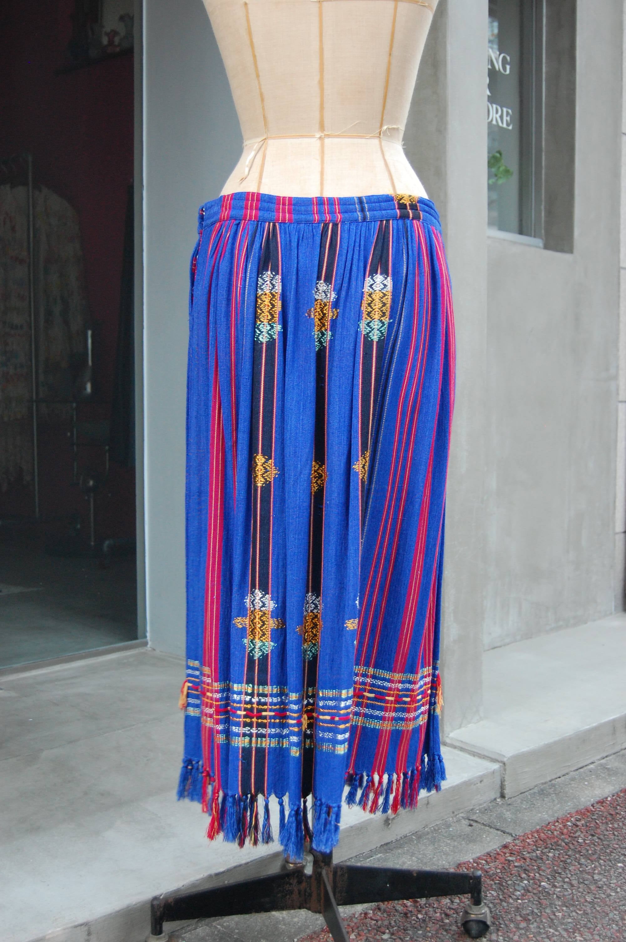 深いロイヤルブルーを基調に、多色のストライプと手刺繍が施されたエスニックロングスカート。
