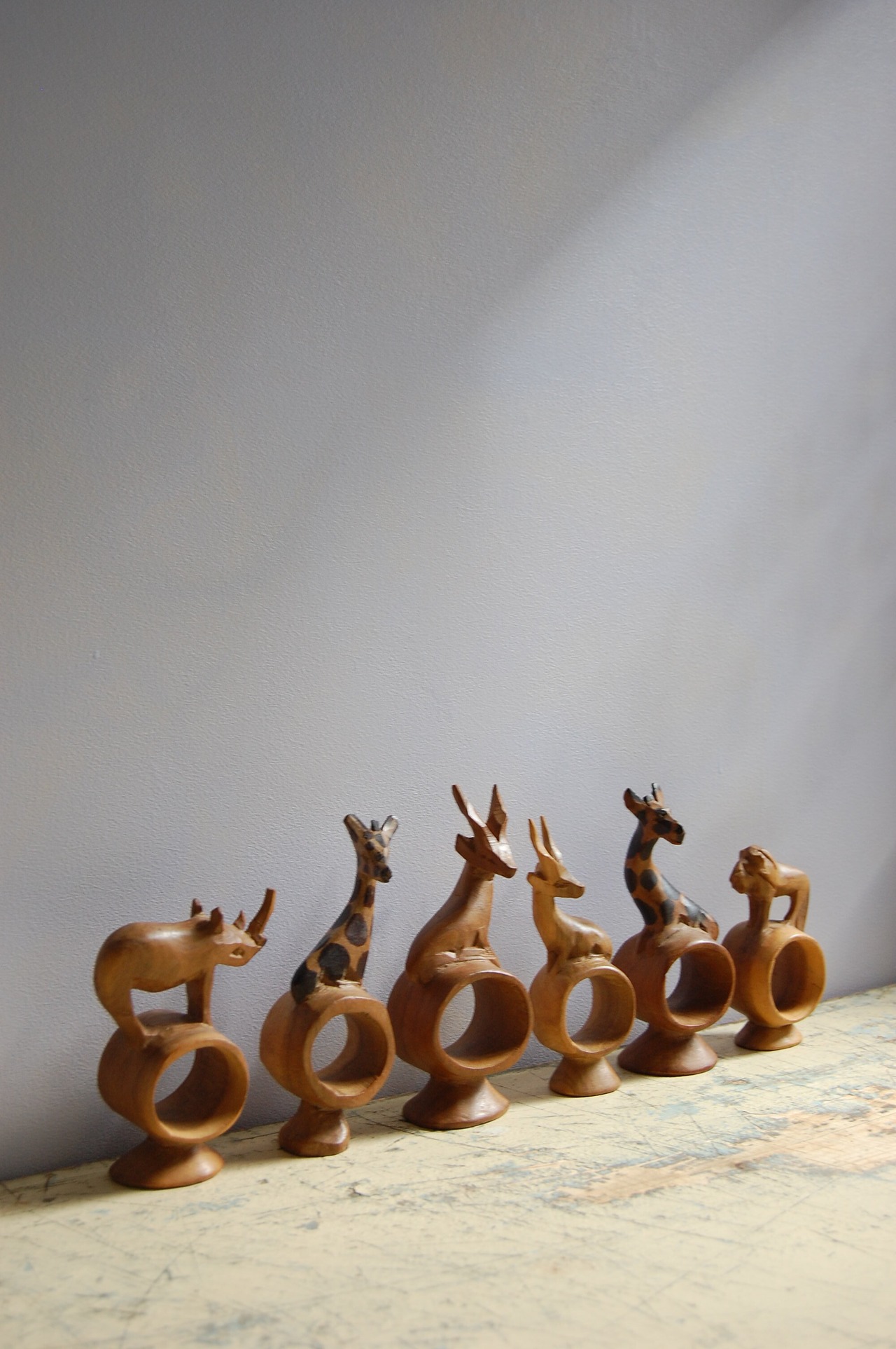 ケニアの職人によってハンドカービングされた、動物モチーフのヴィンテージ・ナプキンリング。