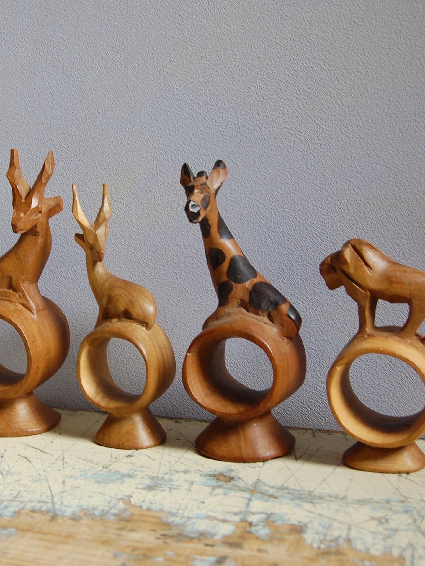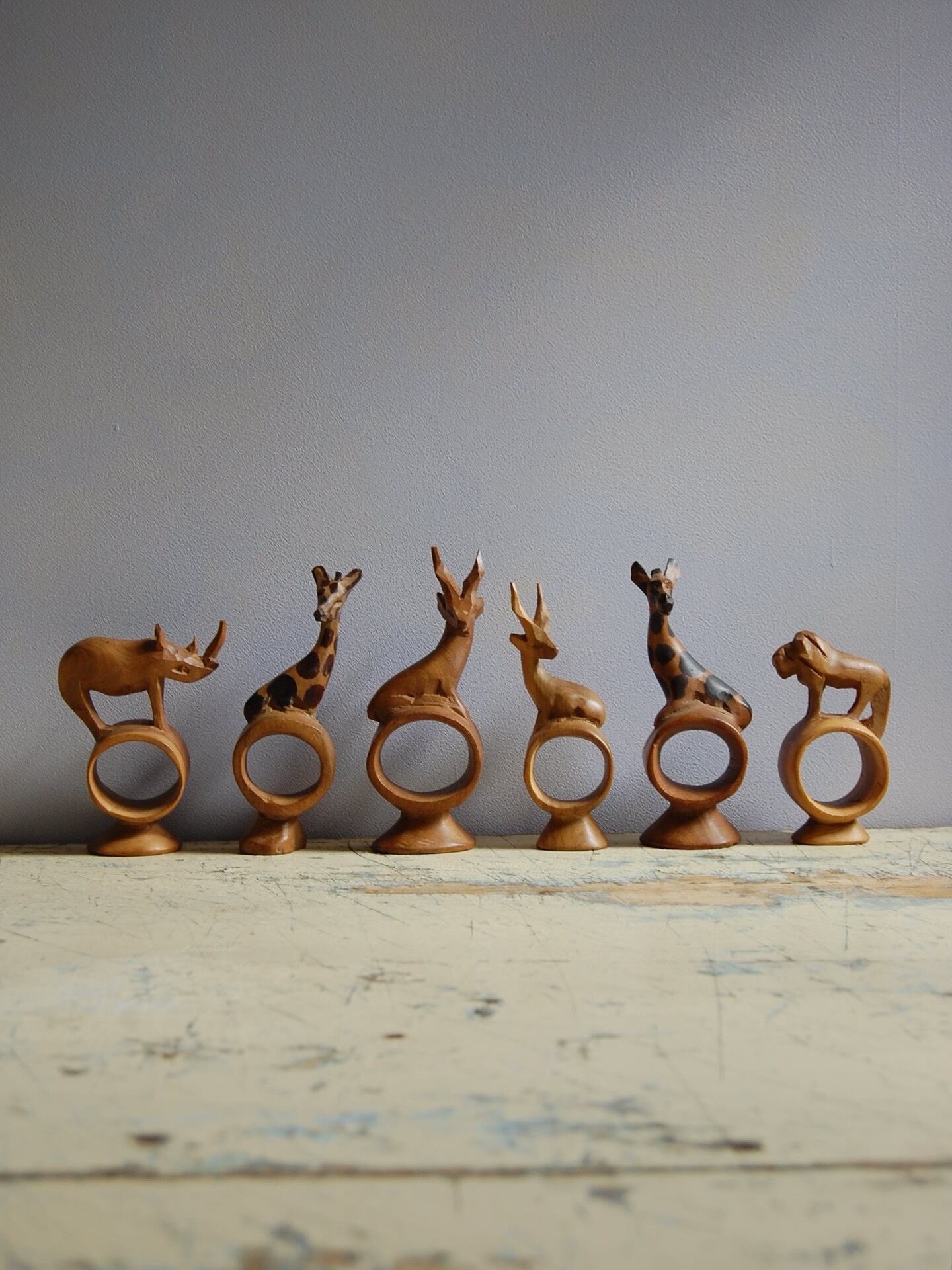 ケニアの職人によってハンドカービングされた、動物モチーフのヴィンテージ・ナプキンリング。