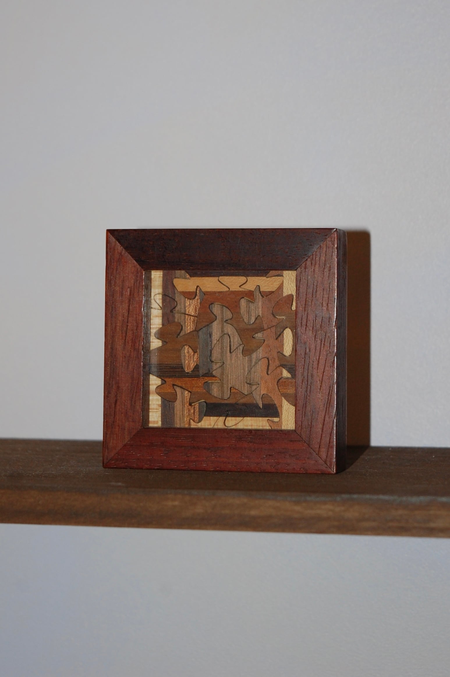 手のひらに収まる小さな木のパズルを収めた、ヴィンテージのアートフレーム。