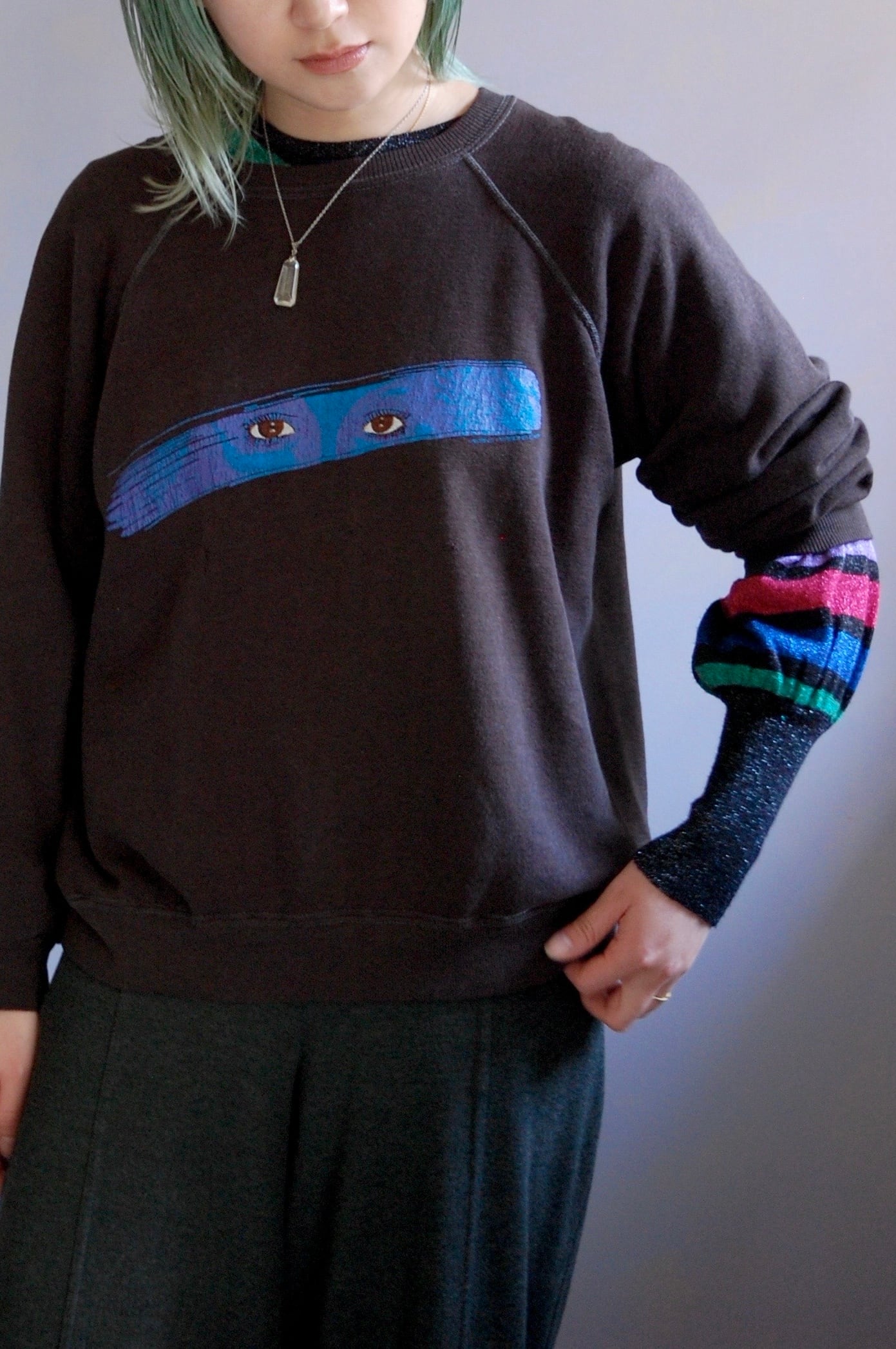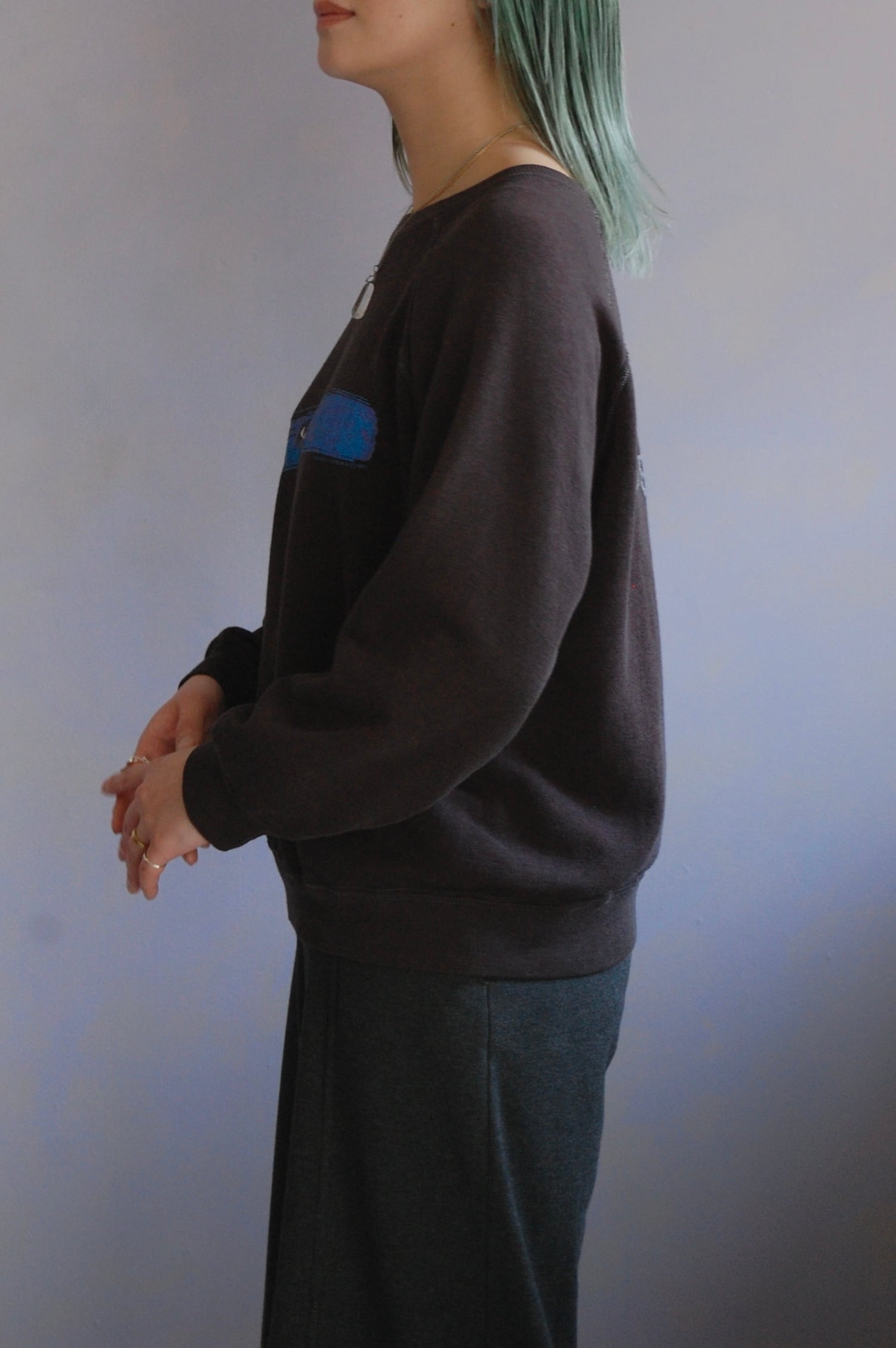 ブラックとターコイズの鮮やかな配色のラグランスリーブに、全体に程よくフェードした雰囲気が特徴です。