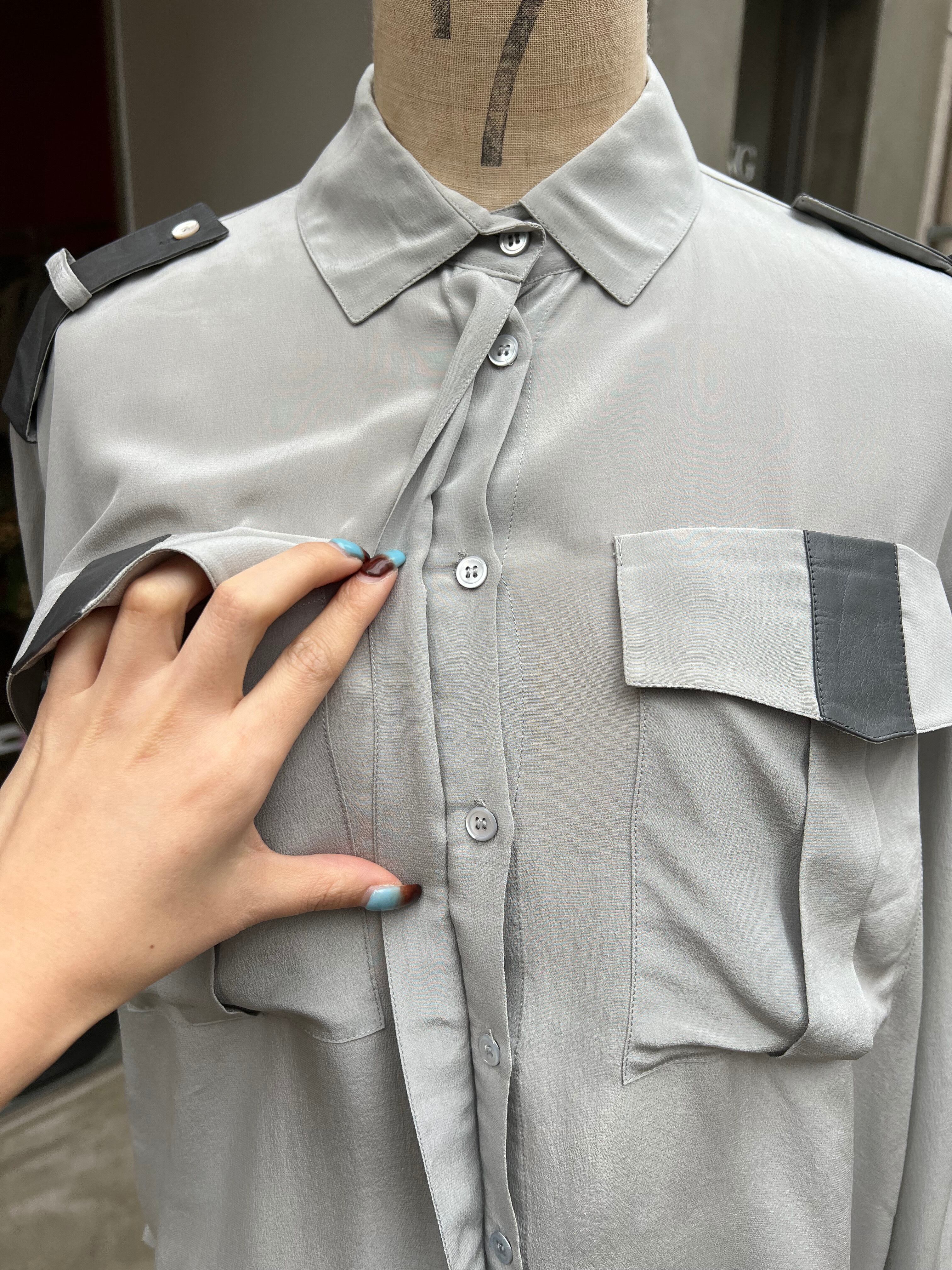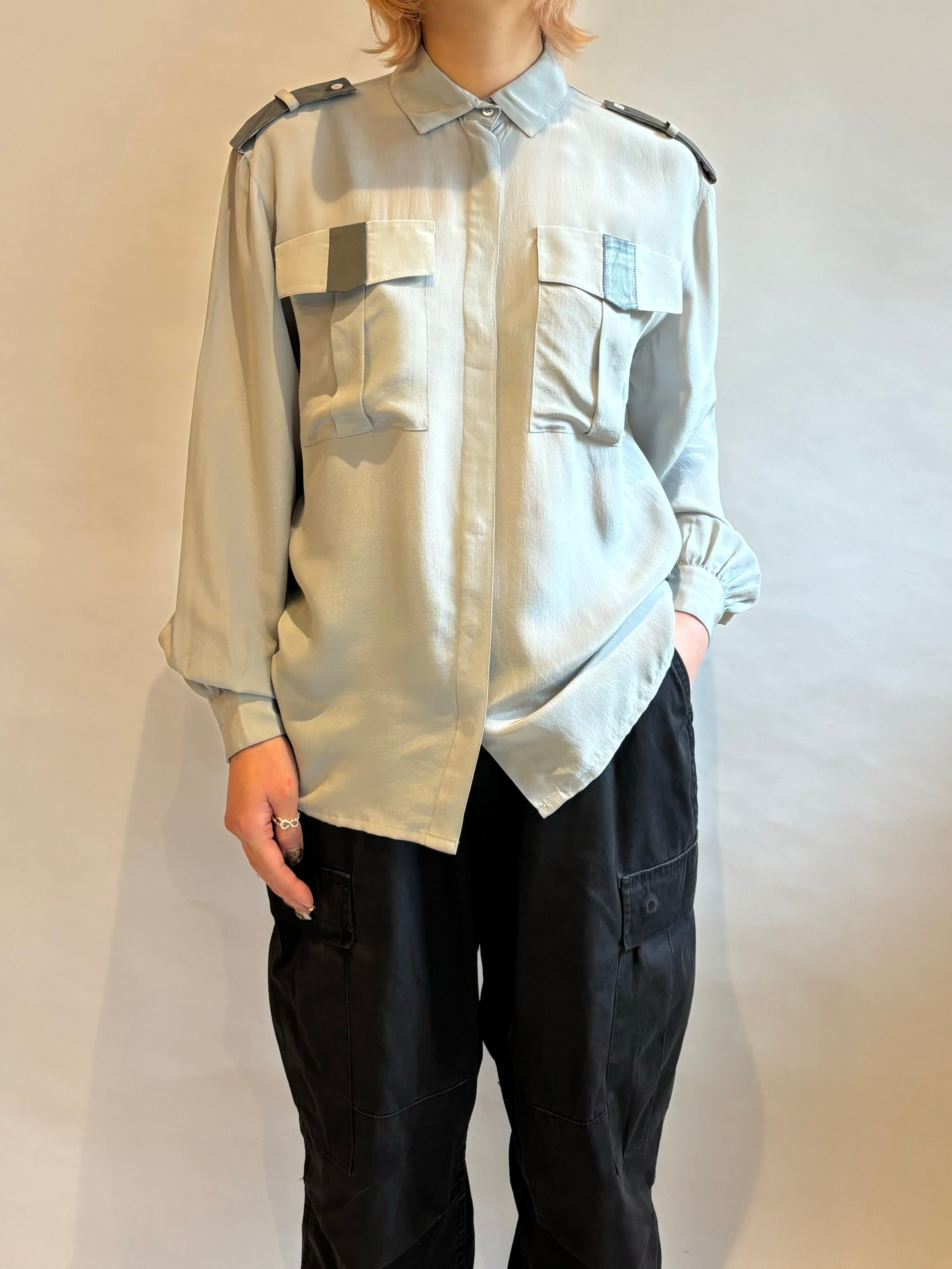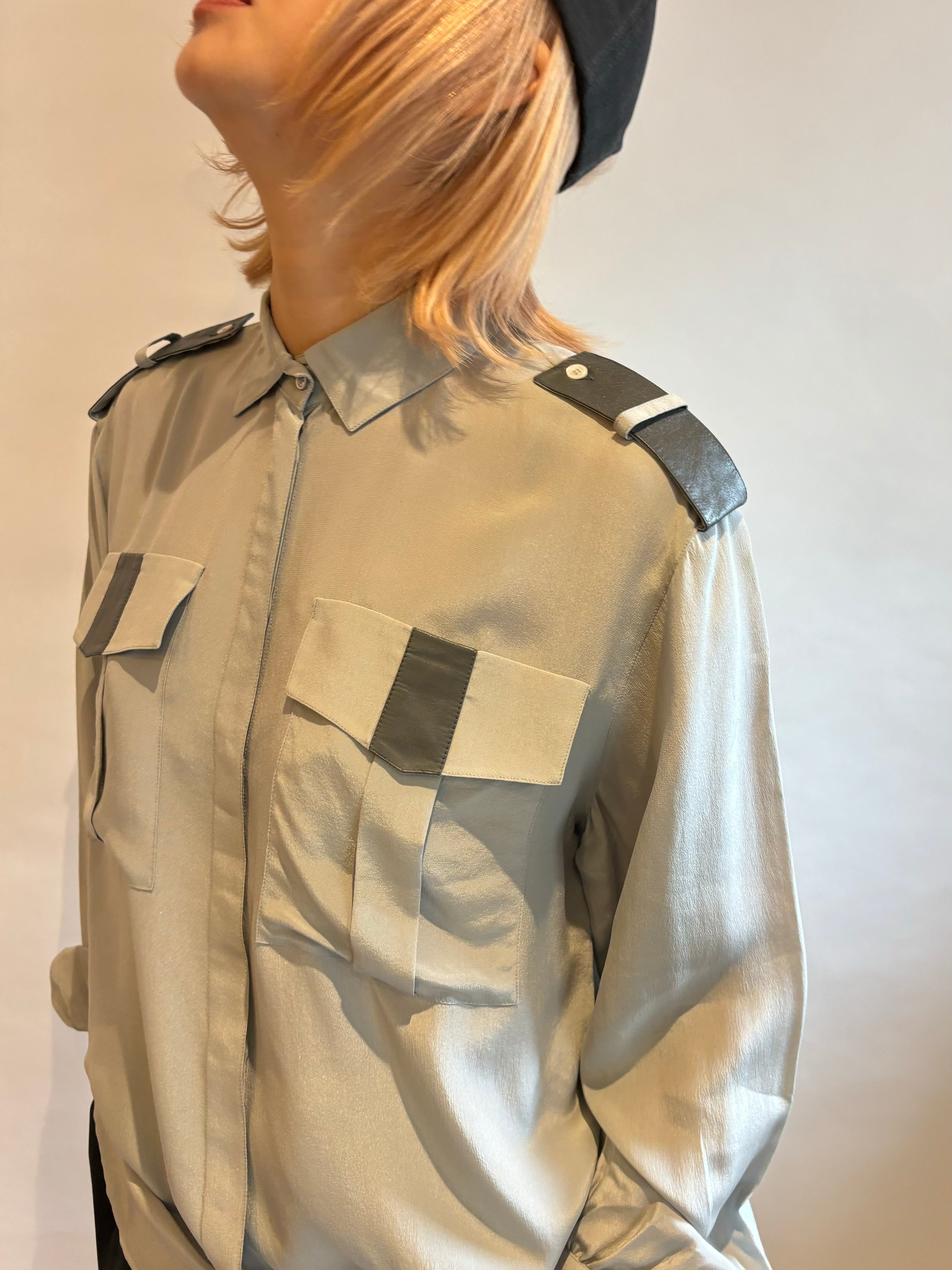 エポレットが付いていたりとメンズライクなディテールですが、シルクとレザーの素材が上品で