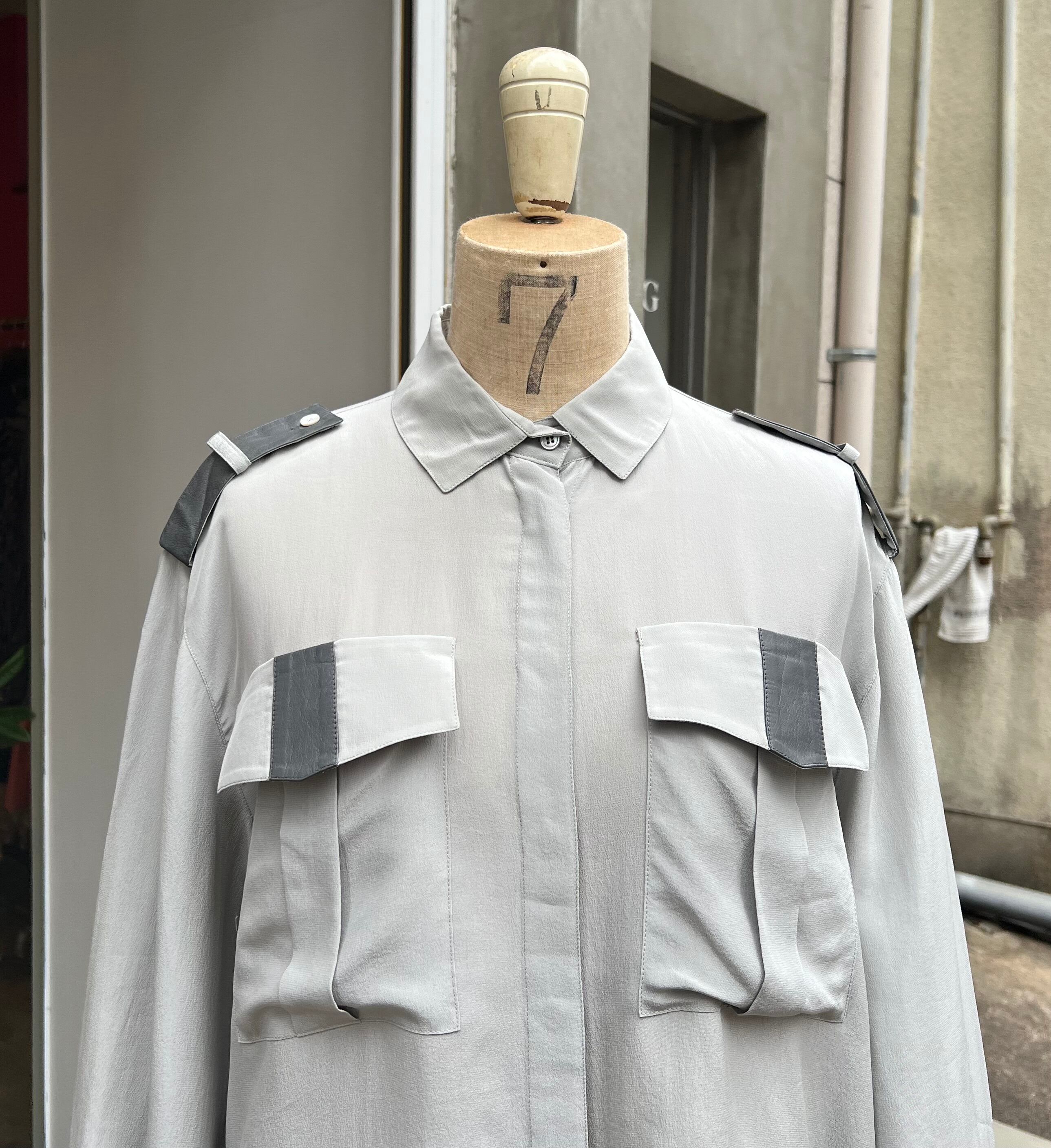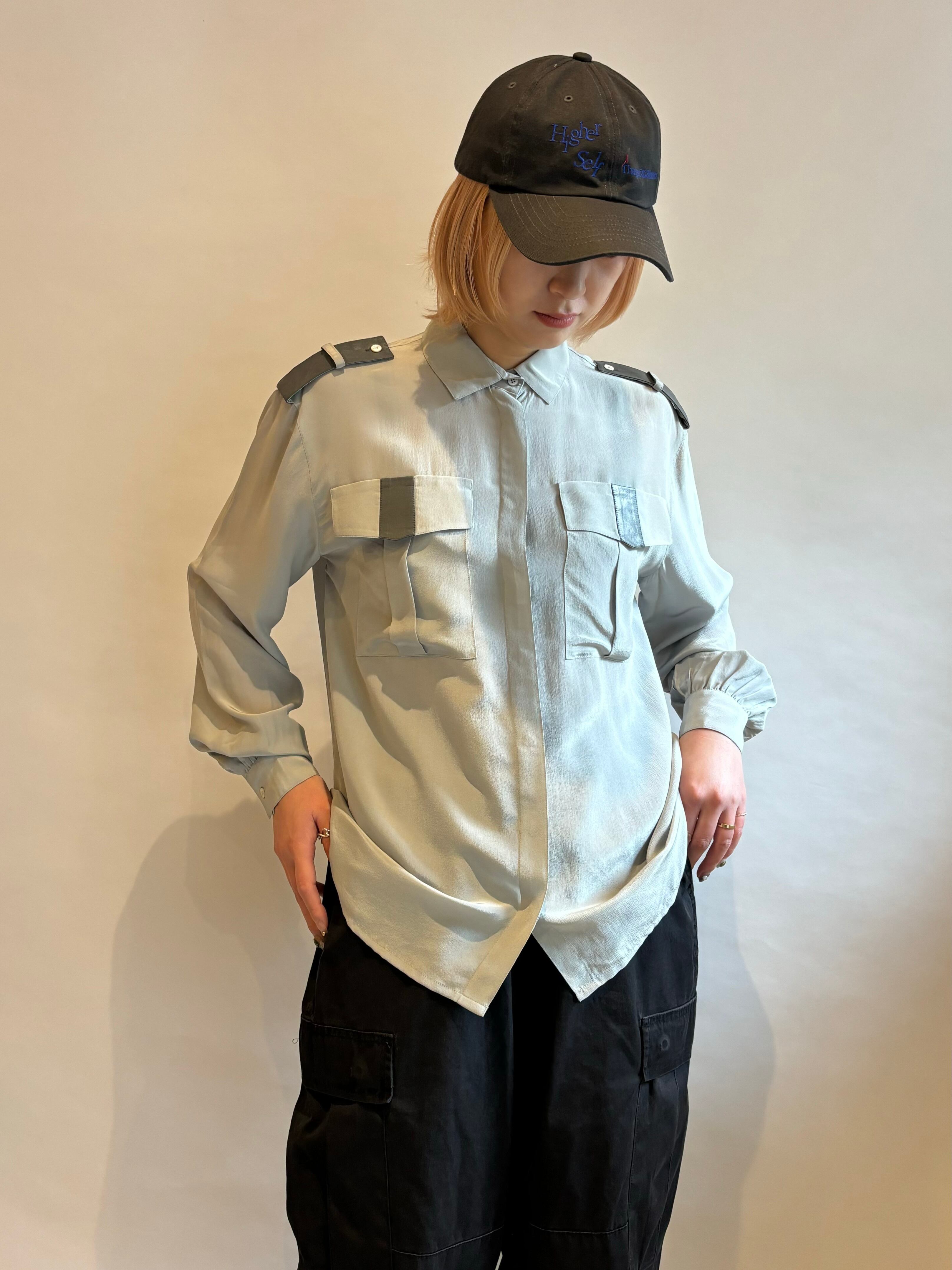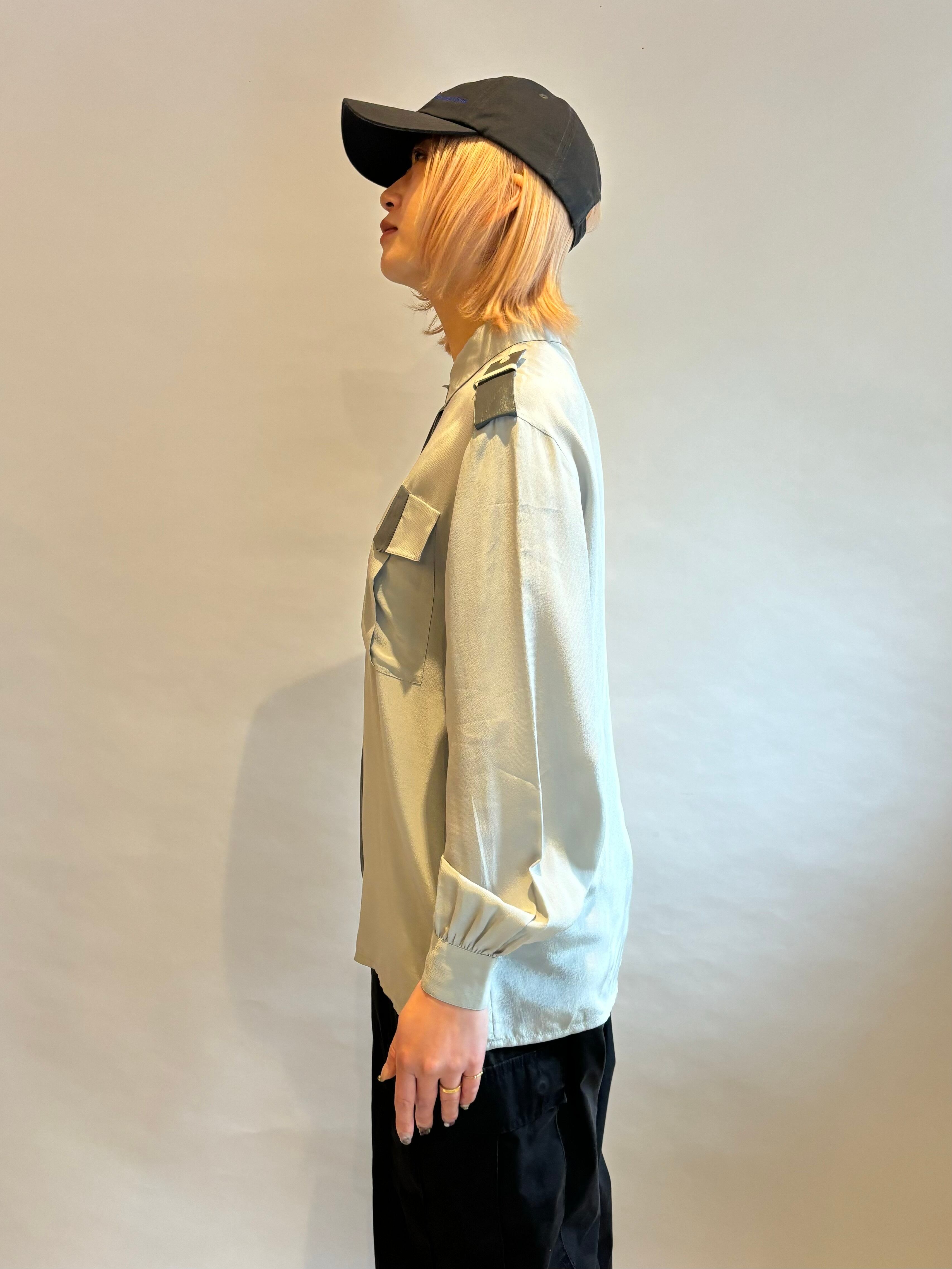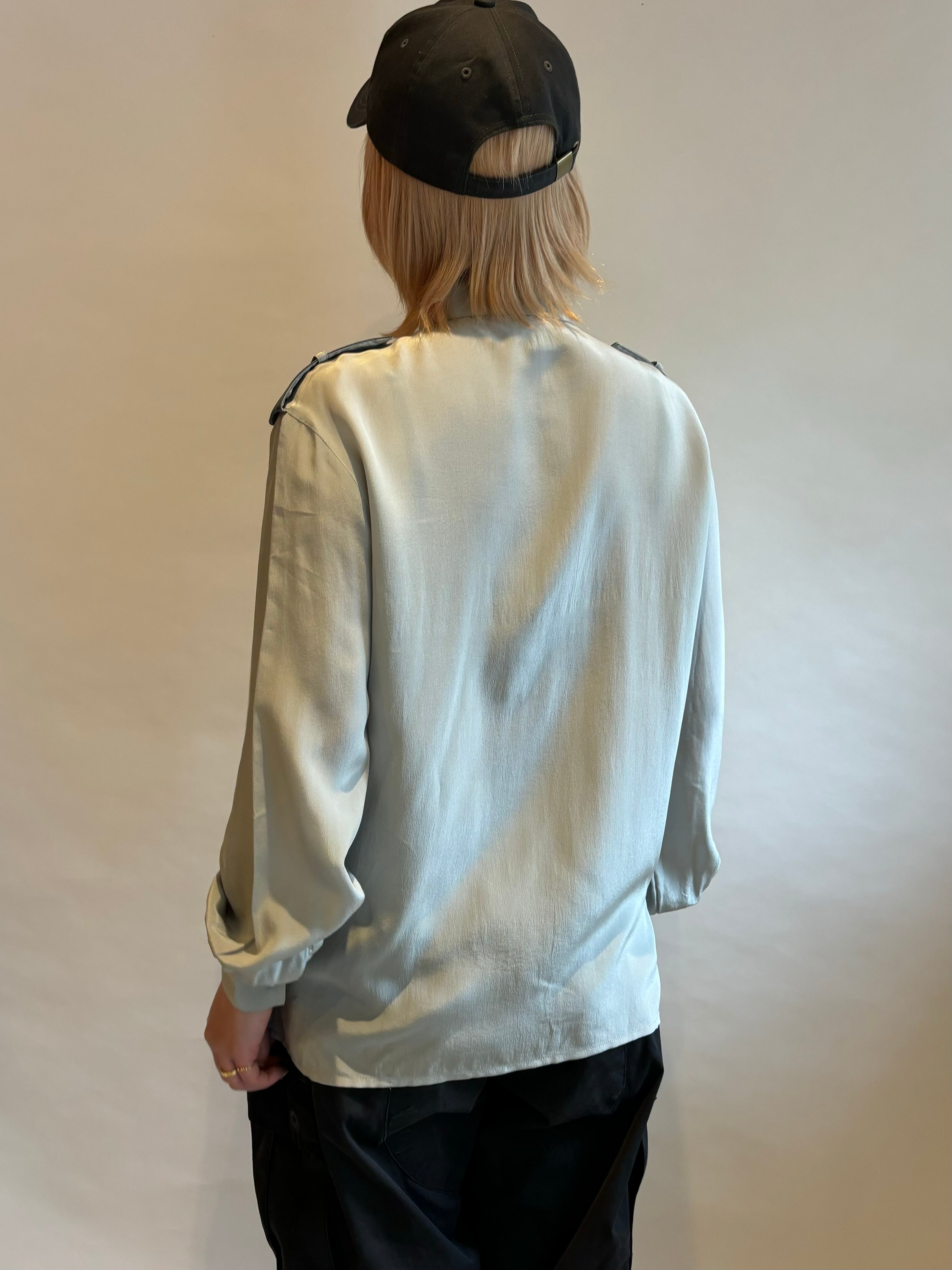 エポレットが付いていたりとメンズライクなディテールですが、シルクとレザーの素材が上品で